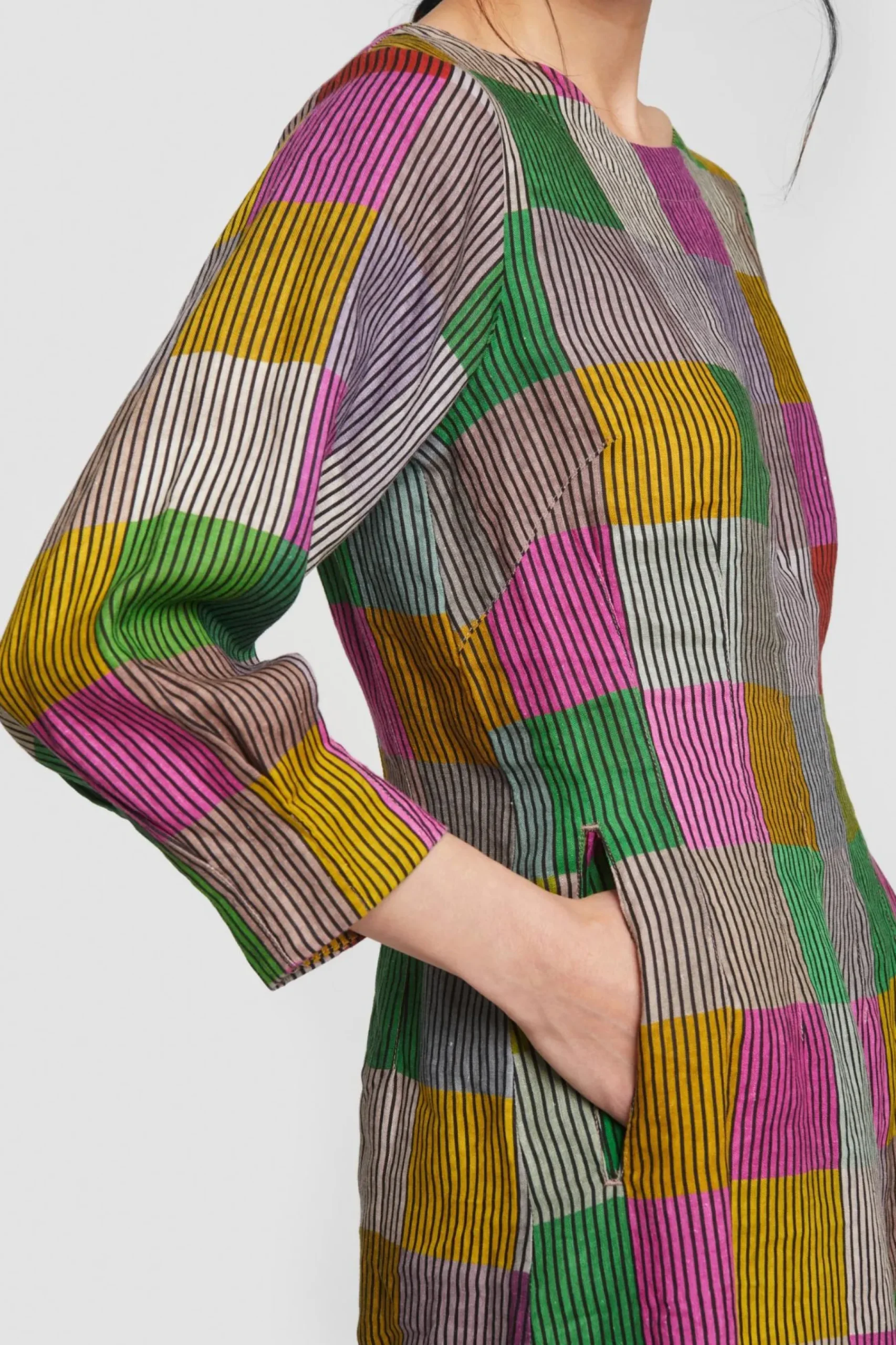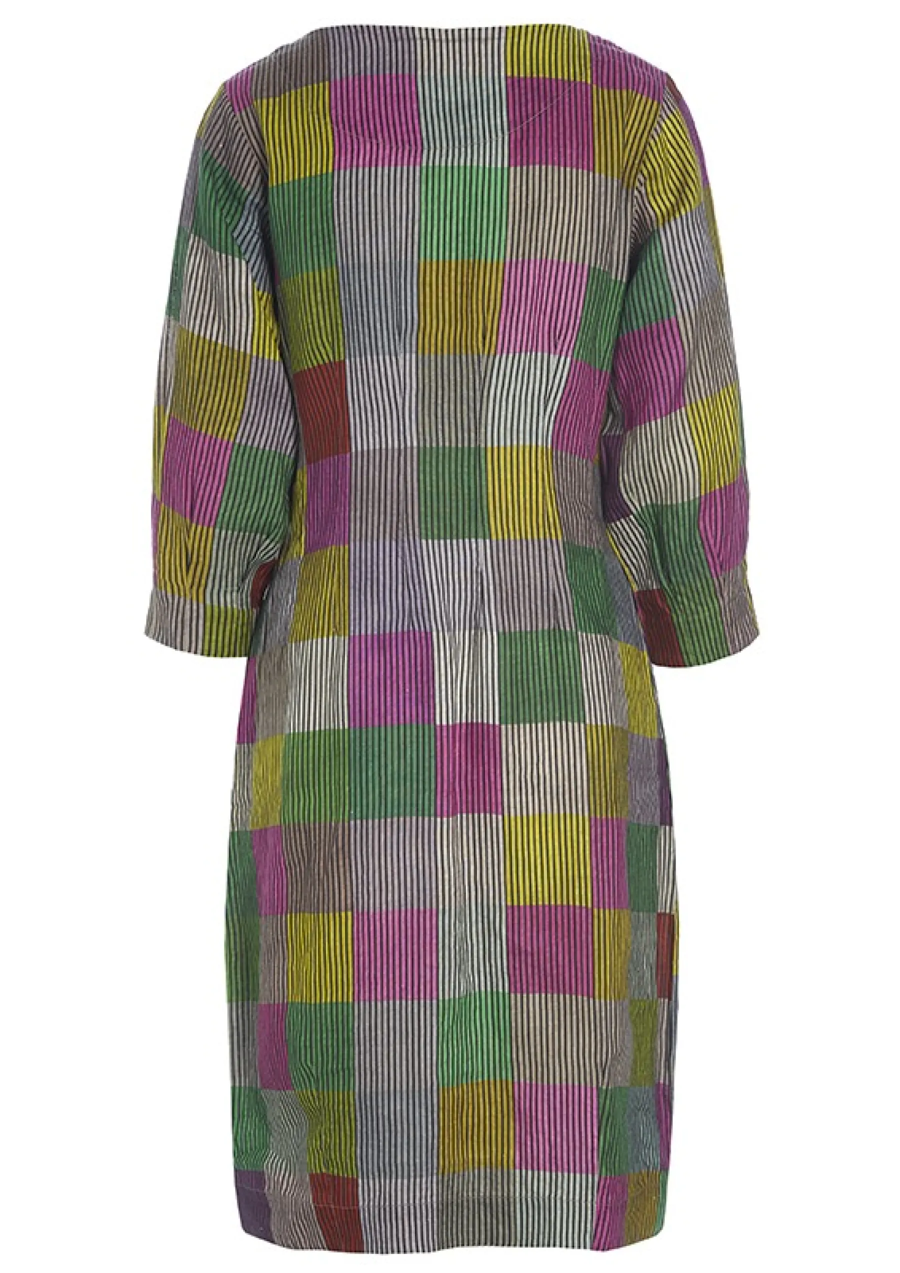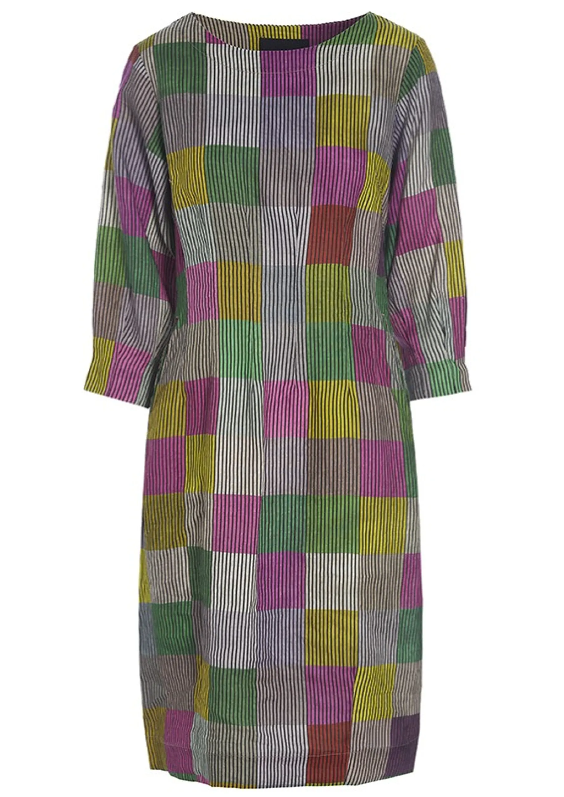 Kjole Med Ternet Monster I Smukt Afstemte Nuancer Pa Stribet Baggrund. Kjolen Er Taljeret Og Giver En Flot Og Feminin Silhuet. Det Er En Kjole, Som Er Oplagt At Bruge Til Hverdag Blot Tilsat Bare Ben Og Sandaler. Kjolen Er Ogsa Fin Med Et Par Lose Bukser Under.