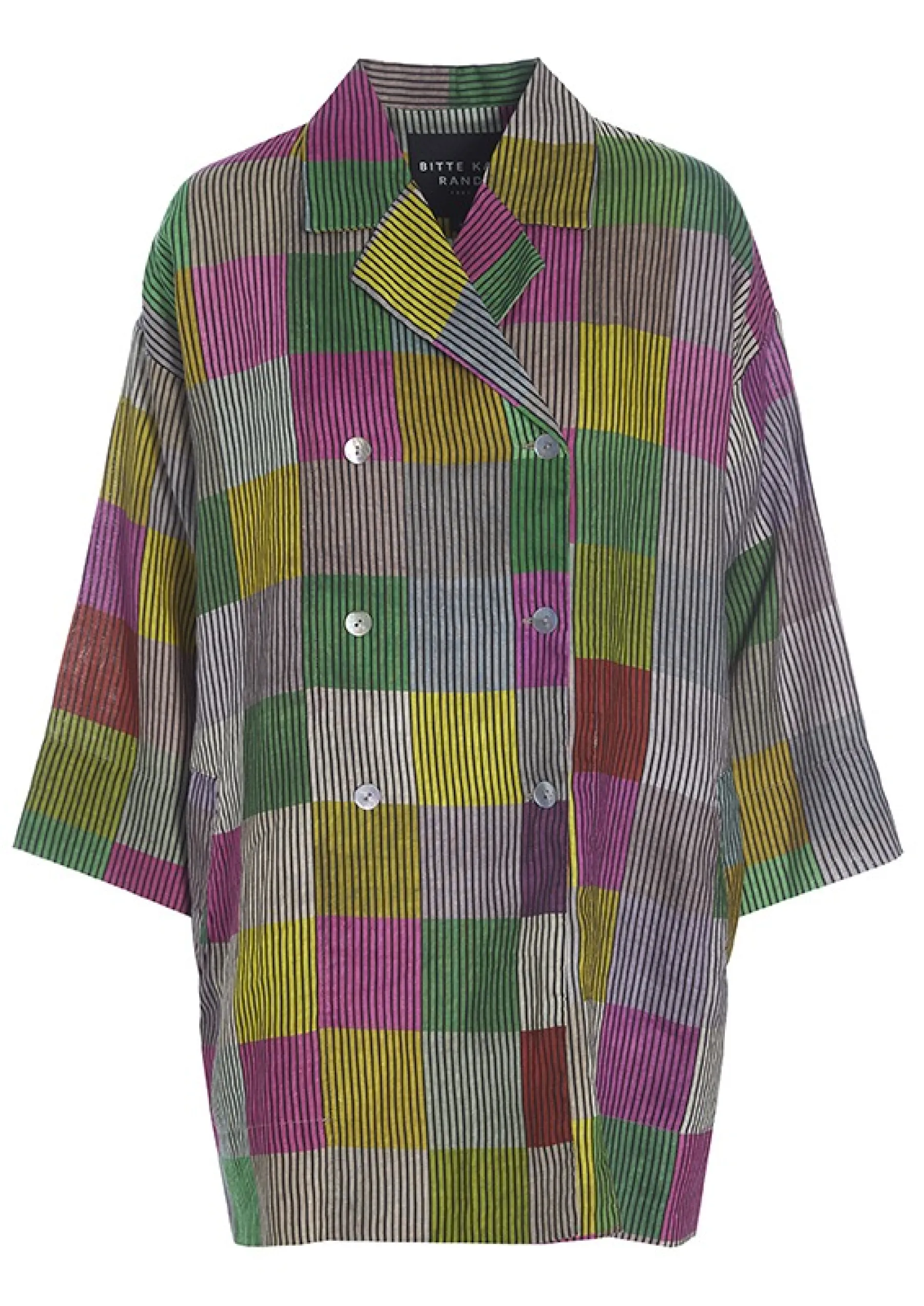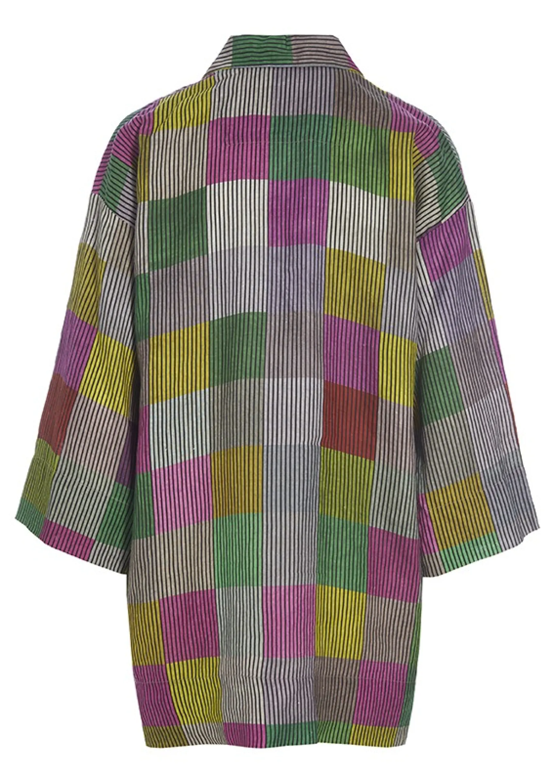 Jakke Med Ternet Monster I Smukt Afstemte Nuancer Pa Stribet Baggrund. Jakken Er Lostsiddende Og Har En God Laengde. Den Er Perfekt Til At Gore Et Basissaet Personligt. Brug Den Over Jeans, En Nederdel Eller Saet De Matchende Chinese Chequers Bukser Til.