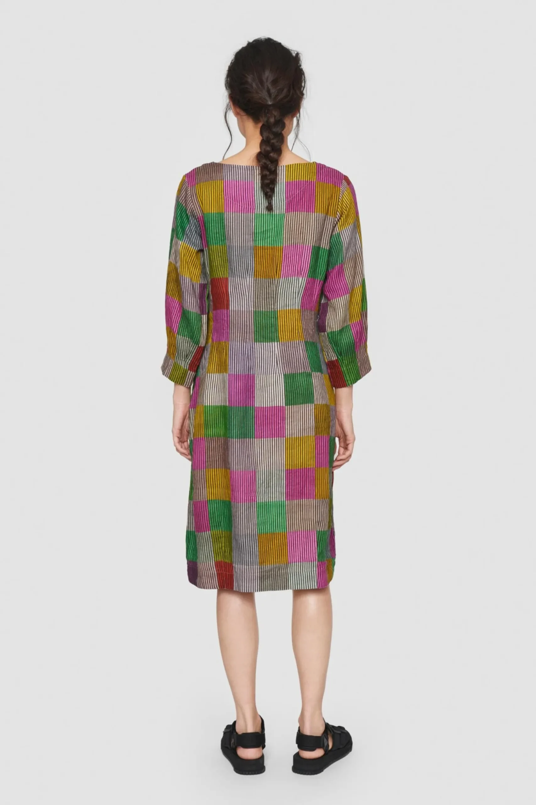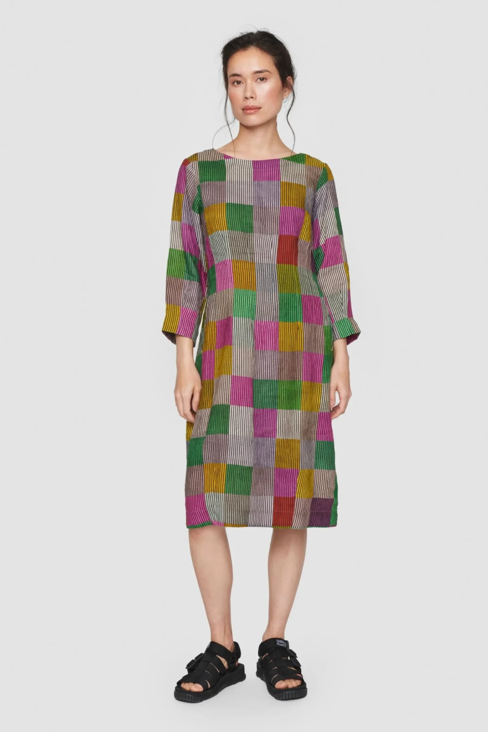 Kjole Med Ternet Monster I Smukt Afstemte Nuancer Pa Stribet Baggrund. Kjolen Er Taljeret Og Giver En Flot Og Feminin Silhuet. Det Er En Kjole, Som Er Oplagt At Bruge Til Hverdag Blot Tilsat Bare Ben Og Sandaler. Kjolen Er Ogsa Fin Med Et Par Lose Bukser Under.