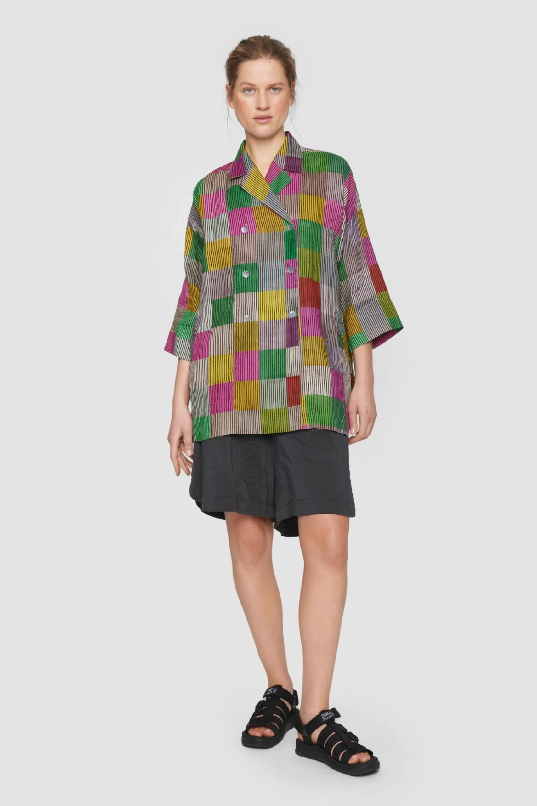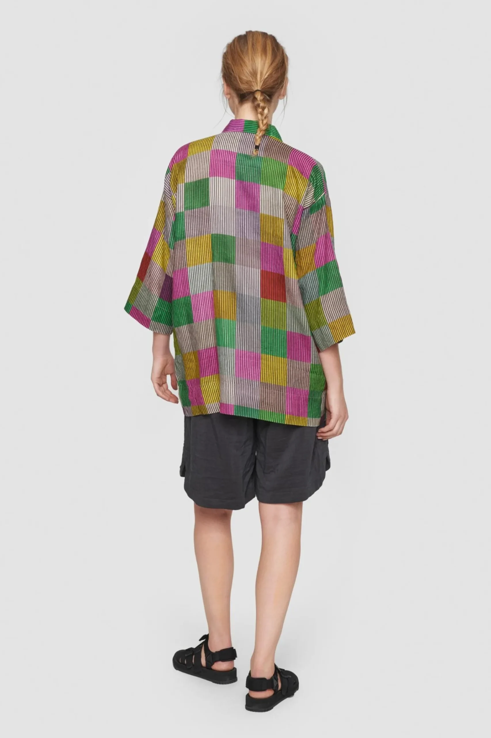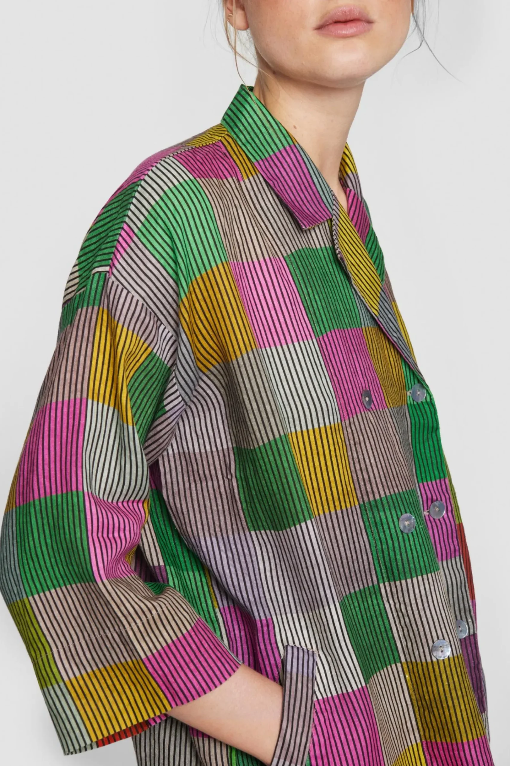 Jakke Med Ternet Monster I Smukt Afstemte Nuancer Pa Stribet Baggrund. Jakken Er Lostsiddende Og Har En God Laengde. Den Er Perfekt Til At Gore Et Basissaet Personligt. Brug Den Over Jeans, En Nederdel Eller Saet De Matchende Chinese Chequers Bukser Til.