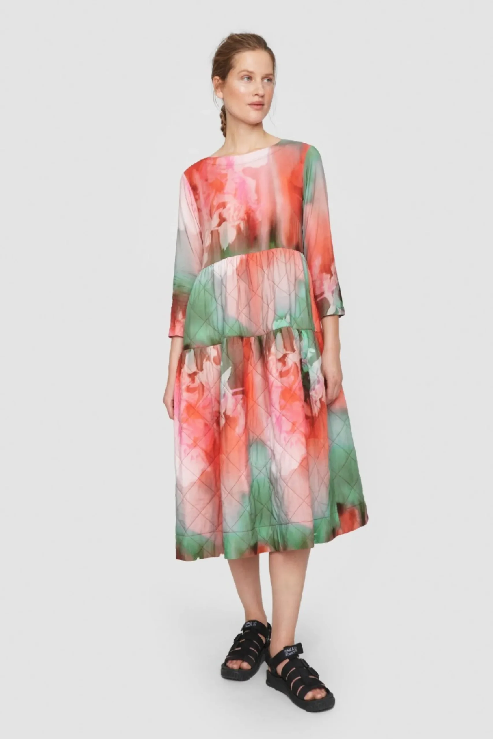 Et Kunststykke Af En Kjole. Det Vatterede Skort Giver En Flot Volumen, Og Sammen Med Det Fine Forarsprint Tilforer Det Kjolen Et Elegant Udtryk. En Kjole, Der Gor Det Enkelt Og Hurtigt At Fa Et Smart Look. Du Behover Blot Saette Sko Til Efter Humor Og Anledning.