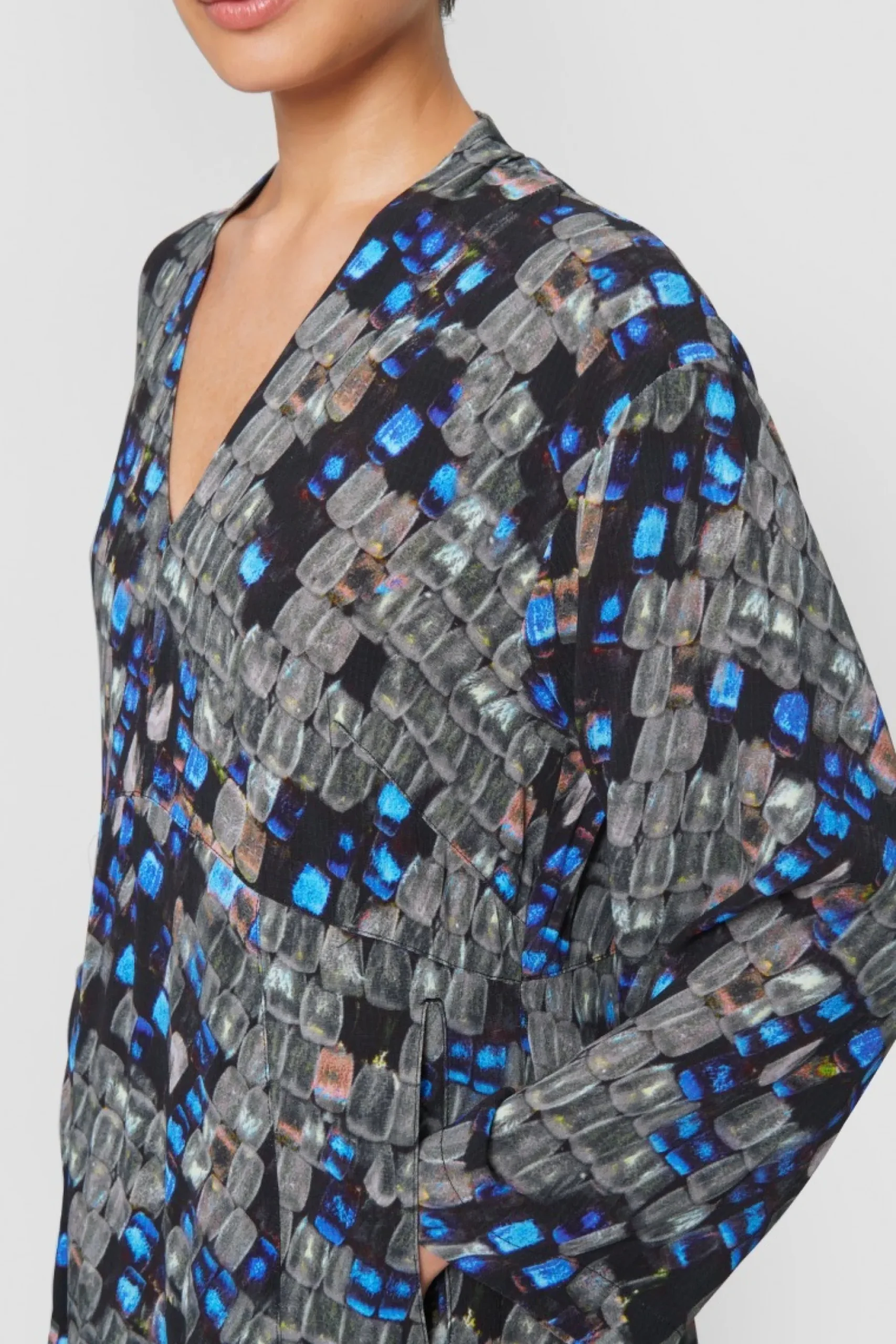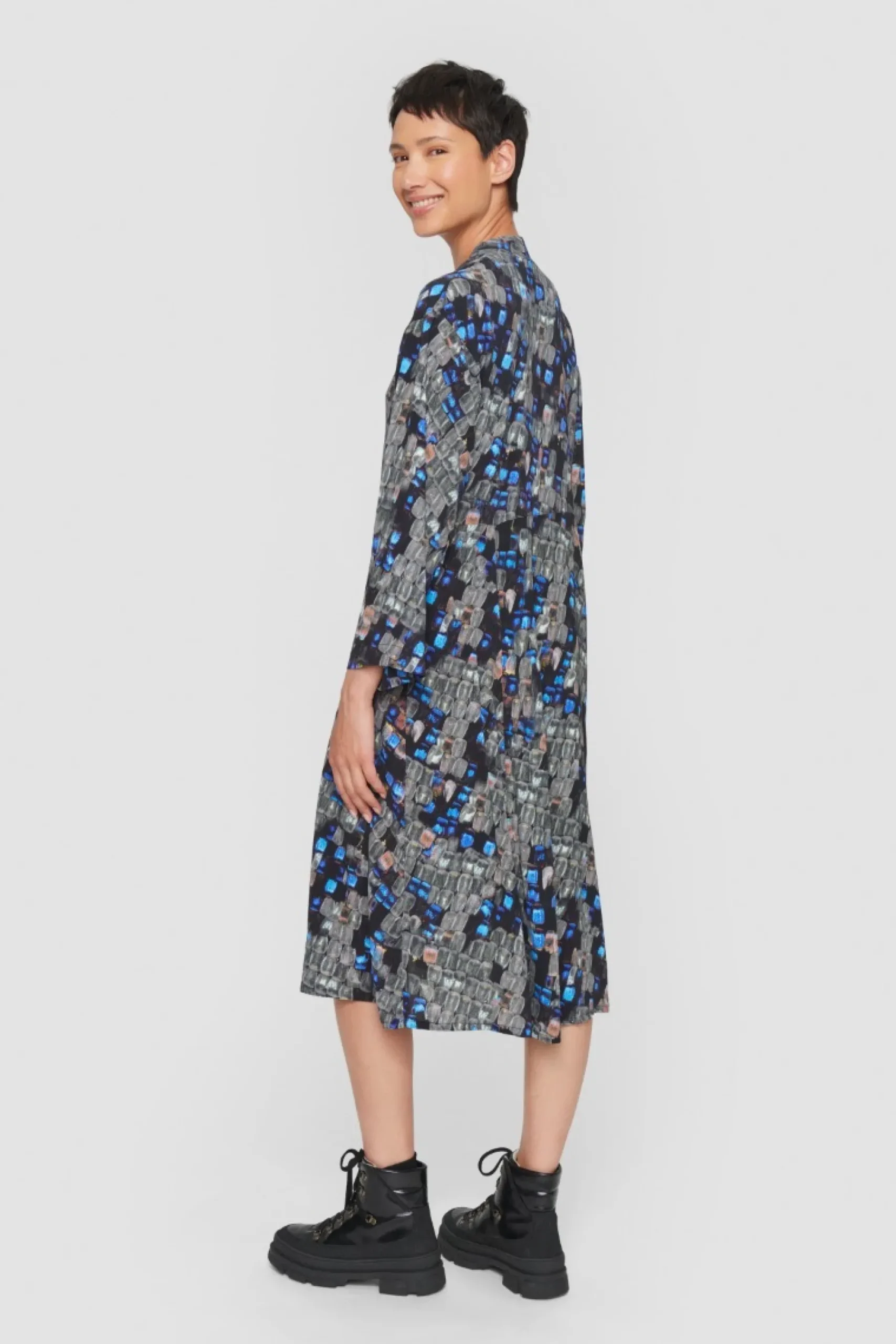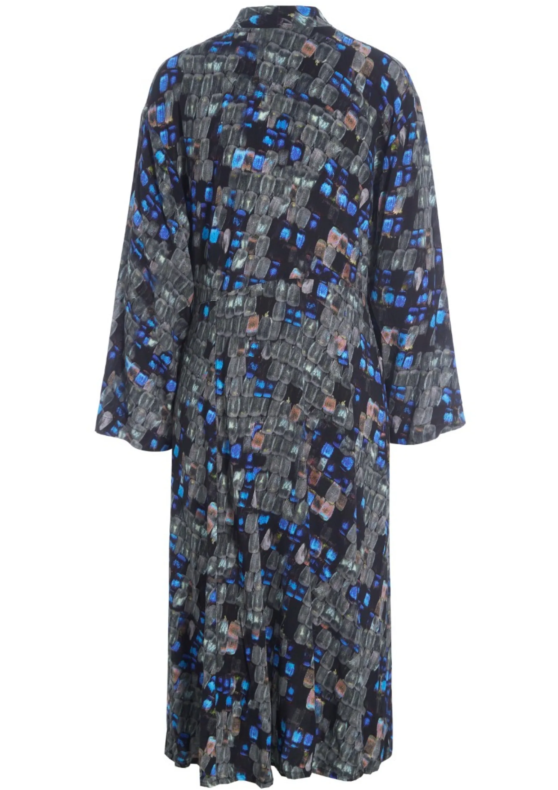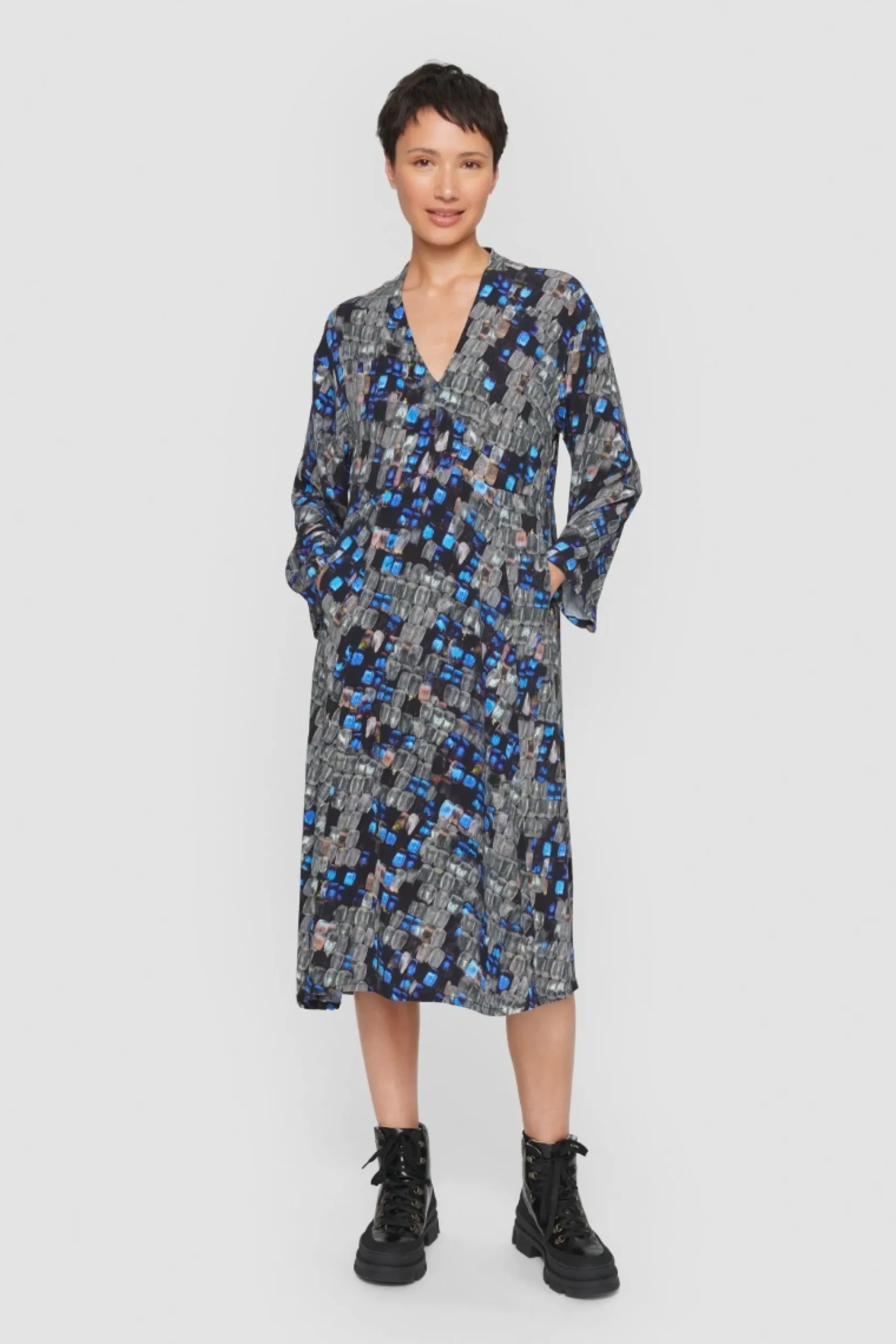 Kjole Med Helt Enkelt Og Klaedeligt Snit, Der Falder Flot Om Kroppen. Det Farverige Og Naesten Magiske Print Vil Live Op Bade Til Hverdag Og Fest. Saet Ballerinaer Til, Der Rammer En Af Nuancerne I Monsteret, Eller Kombiner Med Sorte Herresko Og Flotte Oreringe.